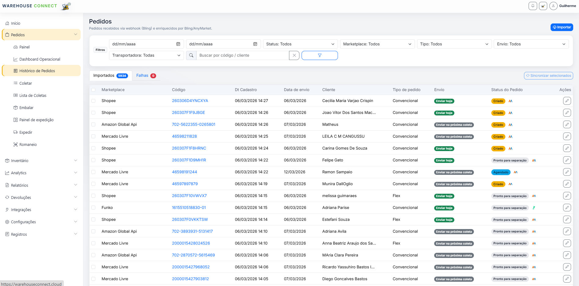 A tela de pedidos foi desenhada para leitura rápida e ação prática. O time enxerga marketplace, código, cliente, data de envio, tipo de pedido, status de envio e status WMS em uma mesma grade, com filtros que ajudam a separar prioridade de rotina.